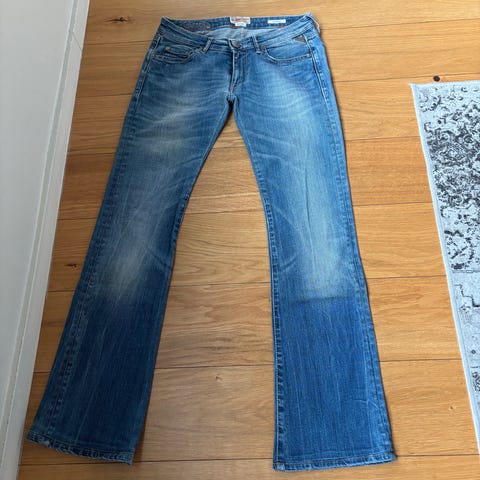 Ett par blåa jeans med raka ben. Jeansen har en klassisk design med fem fickor, bälteshällor och gylf med knappstängning. Det finns en liten logotypdetalj på myntfickan framtill. Baktill finns två fickor med dekorativa sömmar. Liten fläck framsida lår, höger.