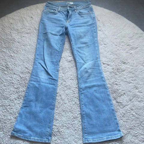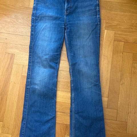 Jeans med raka ben och normalhög midja. Gylf med knapp och dragkedja. Fickor fram och bak. Jeansen har en klassisk design som passar till många olika tillfällen. Slitage baksida benslut då de har varit uppvikta.