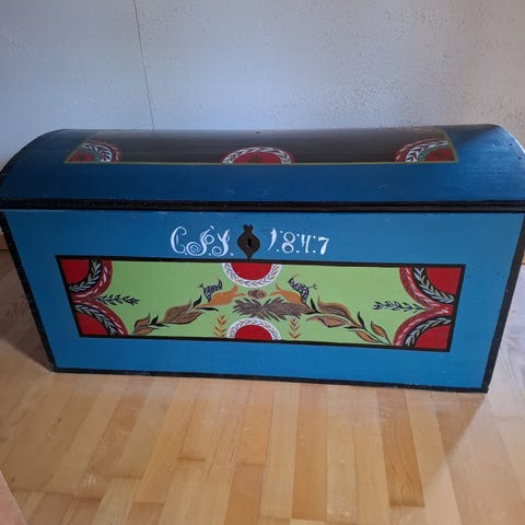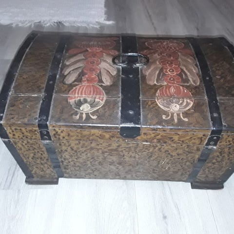 Allmoge träkista i blå färg med handmålad dekor och välvd lockkonstruktion. Kistan har målade ornament och blommotiv på fram- och ovansida samt mörka beslag och band. Passar som förvaringsmöbel eller som inredningsdetalj i hemmet.