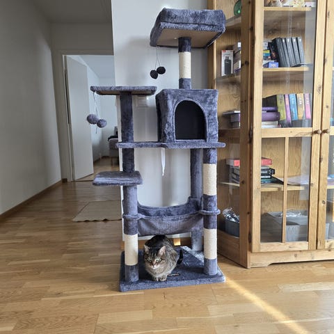 Ett jättefint och stabilt klösträd med mysig bädd högst upp och rejäla klöspelare. Perfekt för en lekfull katt som gillar att klättra, klösa och vila högt upp. 🐾