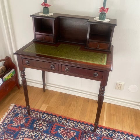 Sekretär skrivbord i mörkt trä med lådor och skåp
