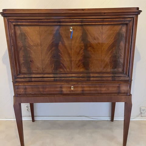 Sekretär skrivbord i mörkt trä med klaff som arbetsyta. Överklaffen döljer flera småfack och små lådor för förvaring av papper och kontorsmaterial. Under klaffen finns en större utdragslåda samt dubbeldörrar som öppnas till ett rymligt skåp. Möbeln står på låg sockel och är avsedd för inomhusbruk, exempelvis som arbetsplats eller förvaring i vardagsrum, sovrum eller hall.