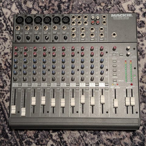 Aria AMX160B 16/2 Mixing Console. Denna mixer har 16 kanaler och 2 bussar. Den är utrustad med grafisk equalizer, VU-mätare för vänster, höger och monitorutgång, samt anslutningar för hörlurar och effektretur/reverb. Varje kanal har kontroller för trim, HI EQ, MID EQ, LO EQ, monitor (pre fader), effekt (post fader), pan och peak-indikator. Ingångar inkluderar CH OUT, LINE IN och MIC IN för varje kanal. Masterutgångar finns för vänster och höger (XLR), samt SEND/RETURN för effekter och REC OUT.