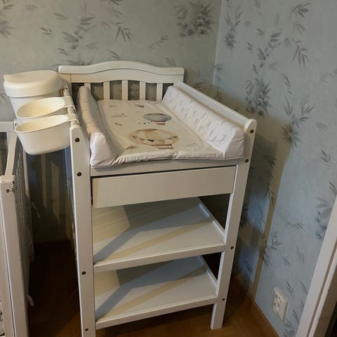 IKEA Sniglar skötbord i trä med vit skivyta. Öppen modell med två plan: övre skötbordsyta och nedre hylla för förvaring av blöjor, kläder och tillbehör. Ingen skötbädd ingår. Har monterat isär skötbordet.