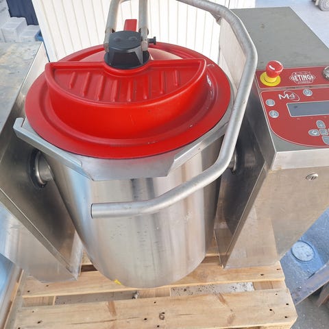 Getinge M2 industrikokgryta i rostfritt stål. Utrustad med elektroniskt styrpanel med display, tryckmätare och nödstopp. Grytan har inbyggd omrörare och insats med galler samt tillhörande verktyg.