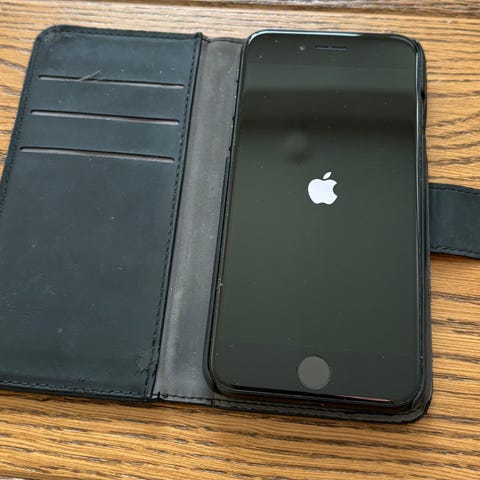 Apple iPhone 7 med 32 GB internminne. Enheten visas här i ett svart plånboksfodral med kortfack och magnetstängning. Skärmen är pekskärm och telefonen har hemknapp på framsidan. Lämplig för vardaglig användning som samtal, meddelanden, surf och appar. Exakta mått, skärmstorlek och övriga tekniska specifikationer följer Apples standard för iPhone 7-