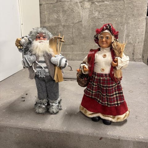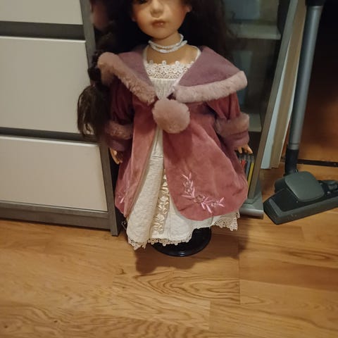 Docka i textil med folkdräktsliknande klädsel. Dockan har ljus klänning med mönstrade bårder, huvudbonad i tyg med liknande mönster samt mörk sjal runt axlarna. Den håller en liten flätad korg med konstgjorda blommor. Passar som prydnad eller samlarföremål. Ingen synlig märkning av tillverkare på bilderna.