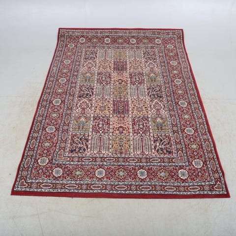 Figural matta med ljust mittfält. Dekor i form av djur, träd och arkitektoniska element i polykroma färger.