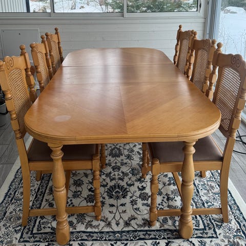 Säljer en gedigen och mycket välhållen matsalsgrupp i ek. Klassisk tidlös design med vackra detaljer och stabil konstruktion. Bordet är utdragbart och säljs med 2 iläggningsskivor. Det ingår 4st stolar och en karmstol.