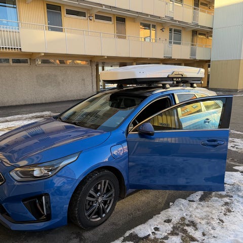 Praktiska skidhållare i takboxen ser till att skidorna ligger på plats under färd.