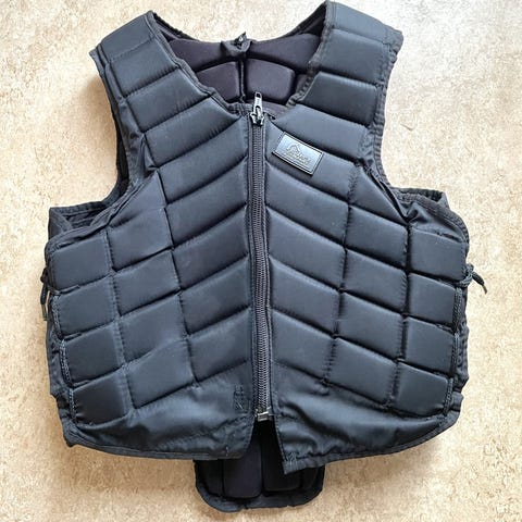 Nova sport ridväst i svart färg. Västen har dragkedja framtill och justerbara sidopartier för bättre passform. På bilderna syns även svarta ridhjälmar, ridhandskar och chaps som kan köpas som helt paket eller var för sig.