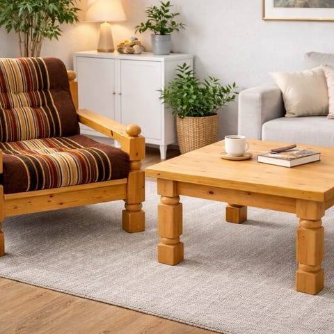 Snygg fotpall i trä med mjuk sits i fårskinn. Klassisk retrodesign (troligen 50–70-tal eller senare i samma stil).