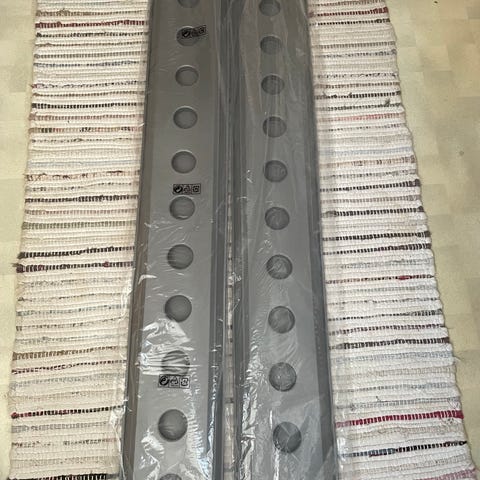 IKEA väggdekoration i metall i grå färg. Består av tre rektangulära sektioner med utskurna öppningar, monterade på en avlång platta. Kan användas som väggprydnad i exempelvis vardagsrum, hall eller sovrum. Monteras på vägg med skruvar eller krokar anpassade efter väggmaterial (fästen medföljer ej om inget annat anges).