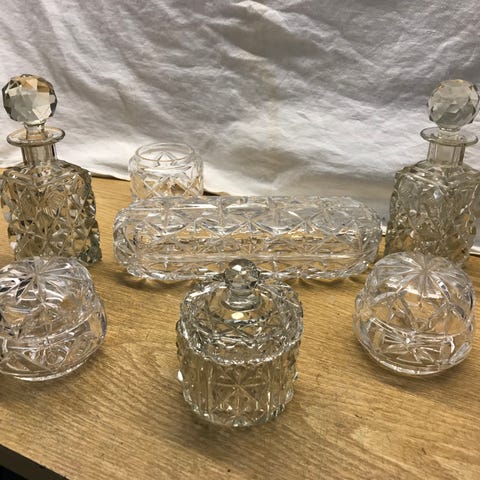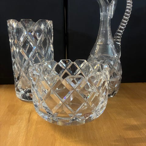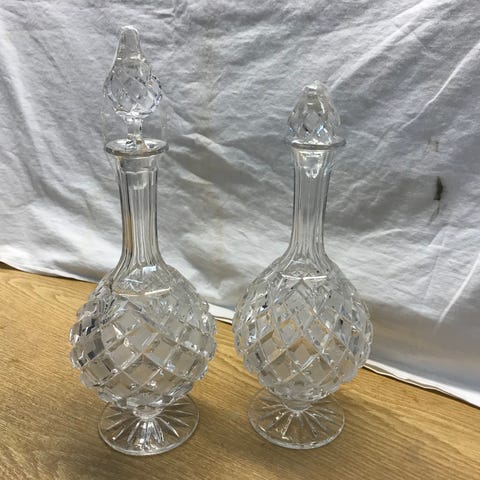 Karaffset med två glasdekanter i klart glas. En fyrkantig karaff med slipat mönster och matchande slipad propp. En rundare karaff med dekorativt mönster och slät rund propp. Passar för servering och förvaring av exempelvis sprit, vin eller annan dryck. Pris: 300kr/st.