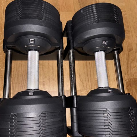 Epsilon justerbara hantlar. Hantlarna har en konstruktion där vikterna kan ställas in med ett reglage, vilket gör det möjligt att använda flera olika viktnivåer i samma set. Hantlarna är ställbara mellan 2,5-24 kg per hantel vilket gör dem väldigt användbara.