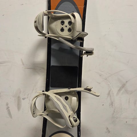 Väldigt bra skick. Pjäxorna är helt oanvända. Brädan har bara åkt en helg. T o m stålkanterna är ok. Nypris 4 500:-.