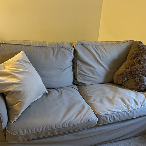 Trotjänare som vi haft i många år och vid ett tillfälle klätt om med tyg från Bemz (finns att beställa nytt både där och på IKEA om man vill ge soffan ett lyft). Synligt använd men ändå helt okej skick, därav priset. Katt finns i hemmet som synes (ingår ej).