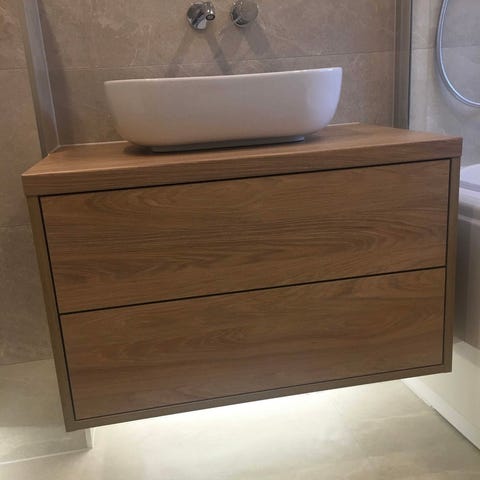 Jag säljer ett badrumsskåp med två lådor i kashmir. Mått: 80 x 46 x 45 cm. Inkluderar svarta handtag.