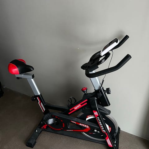 Abilica Exercise Bike AL2 motionscykel i svart med röda detaljer. Utrustad med digital display som visar träningsdata som tid, hastighet, distans och uppskattad kaloriförbrukning. Styret har integrerade handpulssensorer. Sadel och styre är justerbara för att passa olika användare. Motionscykeln lämpar sig för hemmaträning och konditionsträning inomhus.