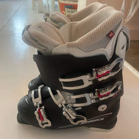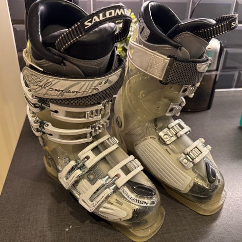 Salomon pjäxor i storlek 26.5. (Ca stl40) Färgkombination svart, vit och röd med metallspännen. Utrustade med fyra justerbara spännen och kraftrem upptill för stabil passform. Sulor med slitstarka plast- och metallpartier anpassade för alpina bindningar. Passar för alpin skidåkning.