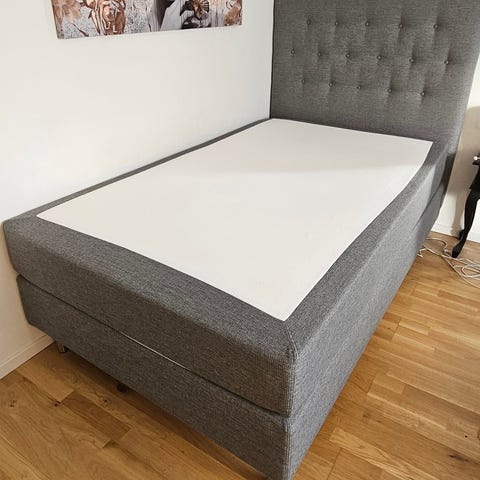 Mio enkel säng med sänggavel i svart tyg. Sängen har en hög, stoppad gavel med knappliknande dekoration. Passar som enkelsäng i sovrum eller gästrum.
