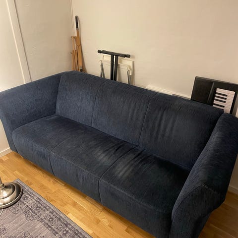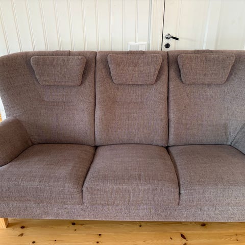 En 3 sits soffa lite svängd. Man sitter högt i den och sen har den hög rygg.