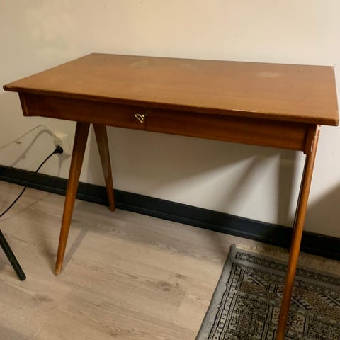 Skrivbord i teak med tillhörande stol. Skrivbordet är något instabilt men i fint skick i övrigt.