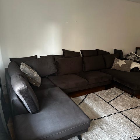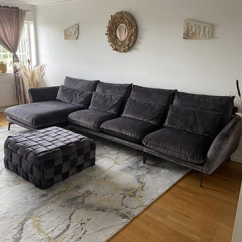 Soffa i svart från Mio med vinklat avslut (5-6personer)djup 170cm,vitlackad ellipsformat bord och en grå matta 150x240cm.Tax finns i hemmet