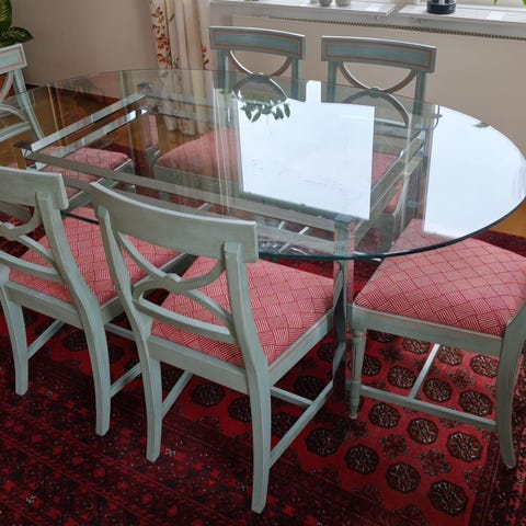 Vitrinskåp 3000 kr, glasbord 1500 kr samt Bellmansstolar 600 kr styck 6 stycken, säljes tillsammans eller separat.