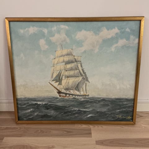 Reproduktion av motivet svenska fregatten Eugenie, monterad i guldfärgad dekorativ ram. Tavlan föreställer ett segelfartyg på öppet hav med klippor i bakgrunden. På baksidan finns informationsetikett om motivet och märkning som anger att det är en reproduktion. Passar som väggdekoration i hem eller kontor med maritimt tema.