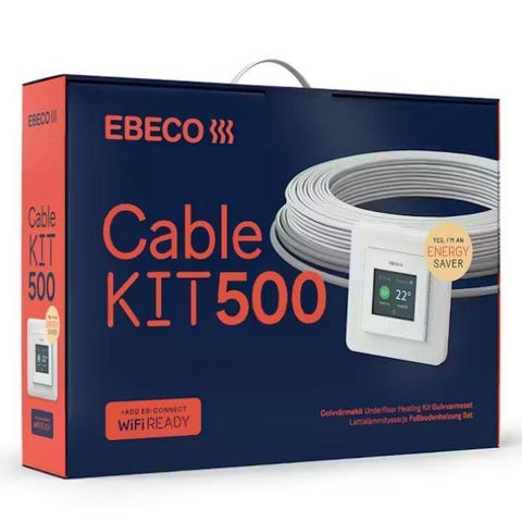 Ebeco Cable Kit 500 golvvärmekabel med termostat för elgolvvärme. Kitet är avsett för 230V installation och innehåller en värmekabel samt en elektronisk termostat med display. Systemet är anpassat för inomhusbruk och kan användas för komfortvärme eller huvudvärme i golv beroende på installation och dimensionering. Passar för montering i exempelvis badrum, hall eller andra utrymmen där golvvärme önskas. Kabeln ska installeras enligt gällande regler av behörig elektriker.