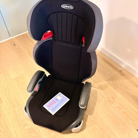 Graco bälteskudde barnstol i storlek 36. Bälteskudden är avsedd för större barn som använder bilens trepunktsbälte. Modellen är svart och har upphöjda armstöd för att hjälpa till att leda bilbältet rätt över barnets höft och bröst. Sitsen placeras direkt på bilsätet och används framåtvänd enligt tillverkarens anvisningar. Passar i de flesta bilar med trepunktsbälte på sittplatsen där kudden ska användas.