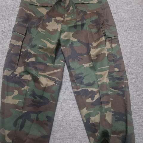 Säljer ett par cargobyxor i klassiskt camouflagemönster. Byxorna har elastisk midja med dragsko, stora sidofickor och resår vid bensluten. Perfekta för en streetwear-look och tillverkade i slitstarkt bomullsmaterial.