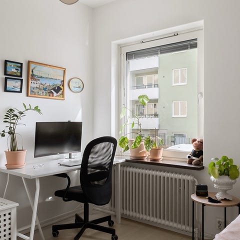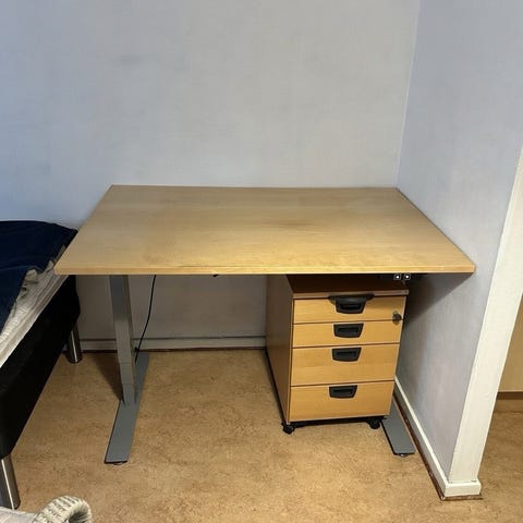 Säljer ett stabilt och praktiskt skrivbord i ljust trä med metallben. Bordet är 120 cm brett och har justerbar höjd, vilket gör att det passar både för studier och hemmakontor. Medföljer en hurts med tre rymliga lådor (ca 77 cm långa och 40 cm breda) som ger gott om förvaring. Bordet är i bra skick med normalt slitage och fungerar som det ska. Perfekt för studentrum eller mindre arbetsyta.