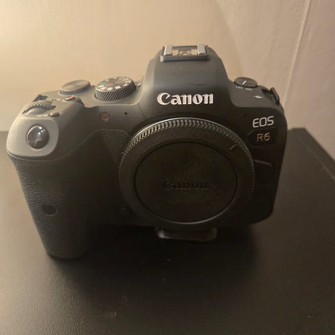 Canon EOS R digital systemkamera i svart + 35 mm lins. Köptes när jag producerade film 2021, men jag använde den bara till ett par dagars jobb, sen har den legat i garderoben.