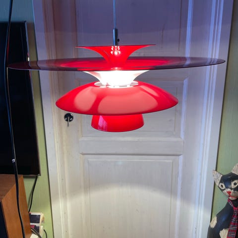 Louis Poulsen PH5 taklampa formgiven av Poul Henningsen. En harmonisk röd färgkombination som inte säljs längre.