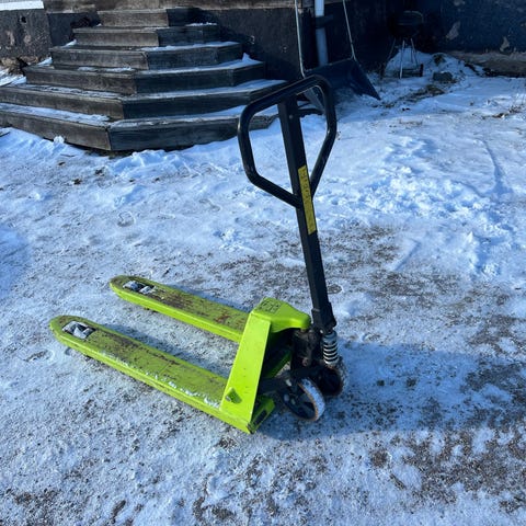 Manuella pallyftare i två färger, grön och blå. Utrustade med handtag för styrning samt gafflar med hjul för lyft och förflyttning av pallar i lager, verkstad eller garage. Lämpliga för hantering av standardpallar på plant underlag. Ingen specifik märkning eller modellbeteckning synlig på bilden.