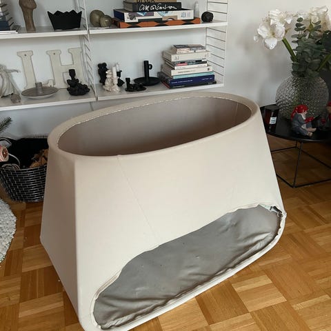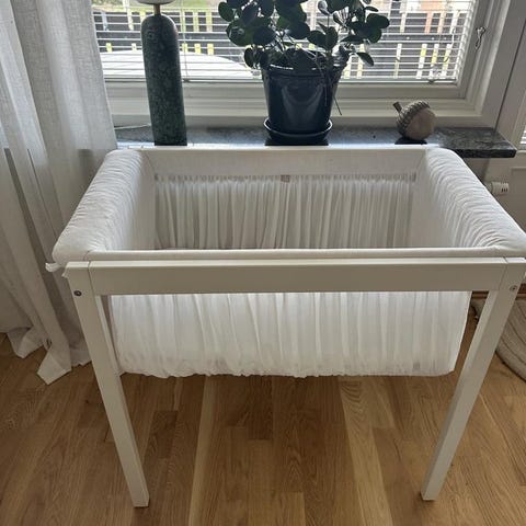Jättebra vagga/barnsäng som passar bra tills bebis börjar ställa sig upp och toppen när spjälsängen känns enorm i början när de är så små och pluttiga :) Toppen att kunna gunga lite för att söva om. Köpte denna begagnad och har använt den väldigt sparsamt. Djur- och rökfritt hem men vill dock nämna att det ser ut som spår av katthår från förra ägaren (bara noterat det i underredet).