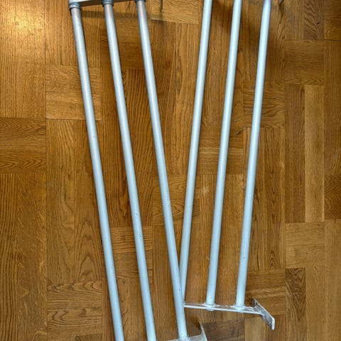 Material: Ek kombinerat med tvärgående rör i metall, utrustad med flera ankarkrokar för att hänga kläder på.