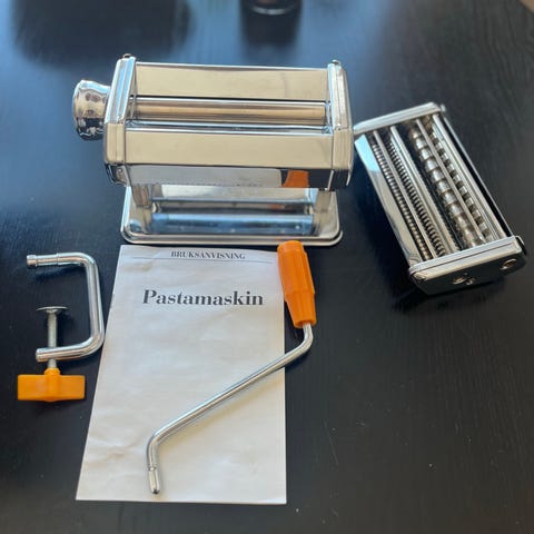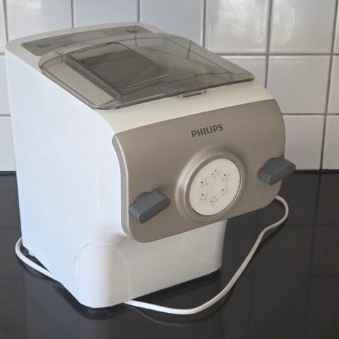Automatisk pastamaskin i fint skick. Vi har köpt till ett extra munstycke för att göra spiralformad pasta.