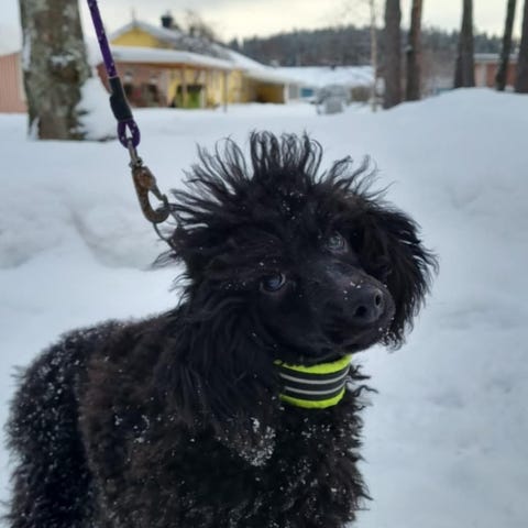 Hon är van att stå i hundgård o göra sina behov där, något vi inte kan erbjuda. Vi försöker träna på att kissa o bajsa i koppel. Något man måste fortsätta med.