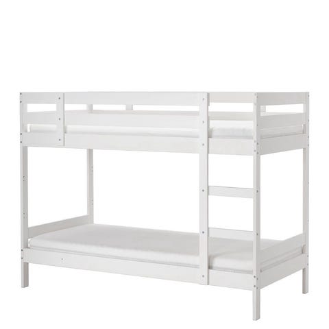 Våningssäng för barn i vitlackat trä. Sängen har två bäddar placerade ovanpå varandra och en stege på sidan för att nå övre bädden. Konstruktionen är rak med stabila ben och skyddskanter runt överslafen. Måtten framgår på bilden med angivna höjder, bredder och längd i centimeter. Passar som platsbesparande sovlösning i barnrum med två sovplatser.