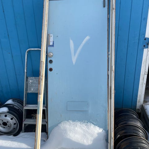 Ytterdörr inkl innerdörr med karm, dock är tröskeln söndersågad