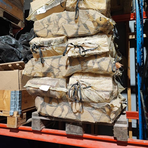 Ved i nätsäck staplad på pall. Passar för användning i kamin, öppen spis eller vedspis. Säckarna i nät rymmer 40 liter ved som underlättar hantering, transport och förvaring samt ger god luftcirkulation