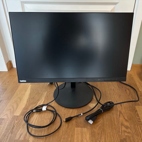Lenovo ThinkVision P24h-20 bildskärm med 24 tum skärmstorlek i svart utförande. Skärmen är monterad på ett justerbart stativ. Baksidan har anslutningar och etiketter med modell- och serienummer. Passar för användning med stationär dator på skrivbord, exempelvis för kontorsarbete, studier eller allmänt datorbruk.