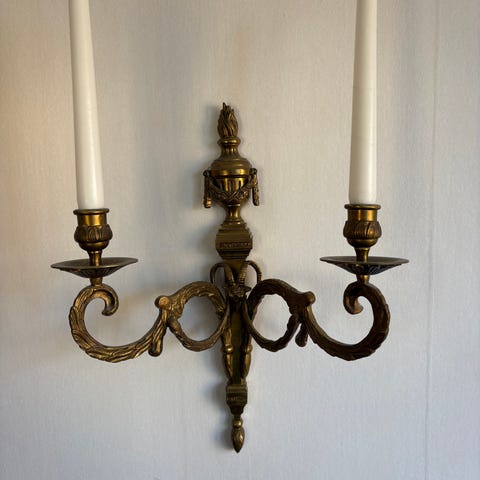 Säljer ett par dekorativa vägglampetter i mässing med plats för två ljus vardera. Elegant design med fina detaljer upptill och svängda armar.