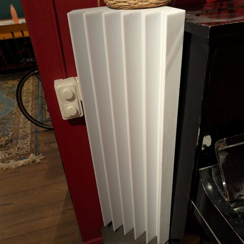 Cementrör fyllda med stenull och klätt i grått tyg. Lite slarvigt, tyget är trasigt här och där.