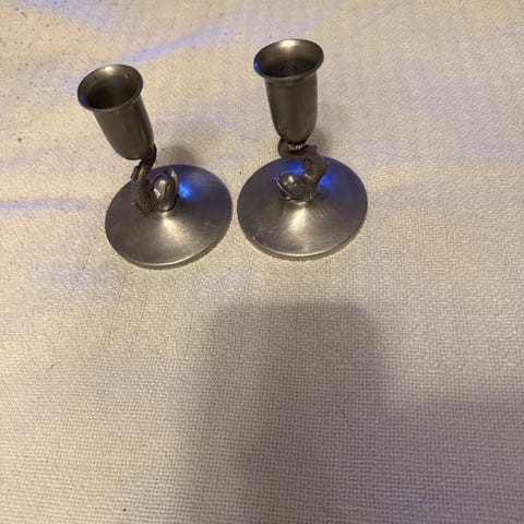 Ett par ljusstakar i tenn, märkta “SVENSKT TENN N8” undertill.