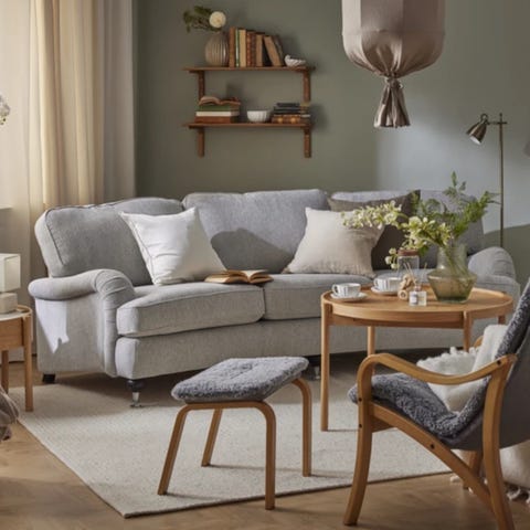 Tygklädsel. Sits och rygg i skum. Ben i massivt trä. B89 x H96 x D87 cm