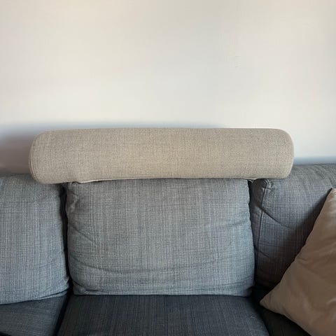 2 stycken Mio runda nackkuddar i grått tyg. Cylindrisk form med textilklädsel och söm runt kortsidan. Passar som stöd för nacke eller rygg i soffa, fåtölj eller säng.